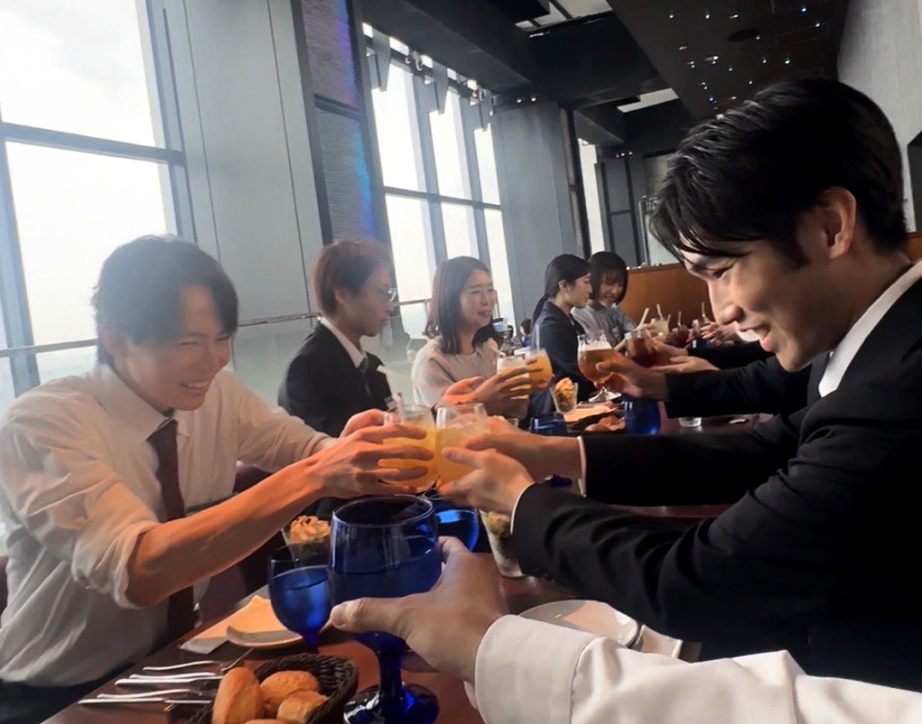 内定式後の懇談会では、社員との交流を通じて、学生生活の様子や将来への思いなど